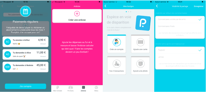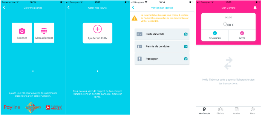 Le principe est simple : lors du téléchargement de l’application, l’utilisateur entre son IBAN pour transférer de l’argent de son compte bancaire vers le portemonnaie Pumpkin, afin de pouvoir transférer de l’argent à ses proches. L’utilisateur peut également associer sa carte bancaire à la plateforme afin que lors des remboursement, l’argent soit directement débité depuis son compte bancaire. Lorsque de l’argent est versé à l’utilisateur, il est gardé sur l’application afin de pouvoir être réutilisé mais il peut aussi être transféré vers le compte en banque de l’utilisateur.